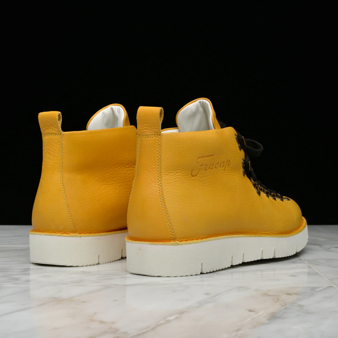 Lapstone & Hammer has once again joined force with the esteemed Italian bootmakers, Fracap, to create another exclusive range of beautifully handcrafted boots. TheĀ M120 "Taxi"Ā features a yellow mid-cut upper made from tumbled Italian calfskin leather with a natural calfskinĀ liningĀ and "Fracap for Lapstone & Hammer" stamped on the tongue and insole. A white midsole leads into aĀ whiteĀ Vibram V-Lite Cut Sole that weighs so little it makes this boot feel lighter than a sneaker. Antique brassĀ d-rings and grommets serve as the hardware for the navyĀ laces or the alternate red laces included with every pair. Each boot is handcrafted in ItalyĀ andĀ comes packaged with a brush and conditioner.