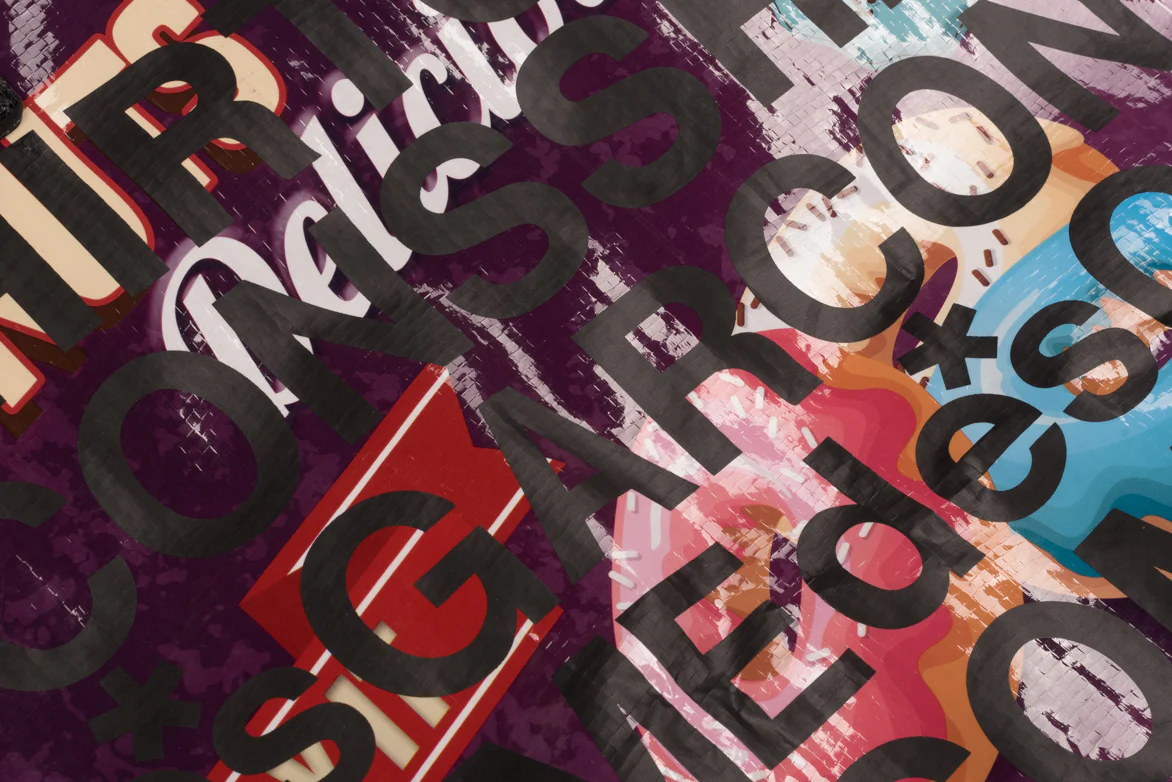 From über-hip Japanese brand CDG's diffusion line, Comme des Garçons SHIRT, comes this "Sweets" PVC Shopping bag. The bag is made from 100% polypropylene and styled like vintage advertising posters, onside featuring cupcakes on a blue background, and the other side donuts on a purple background. Black CDG branding overlays the graphics on each side, while faux-leather handles give the busy design a touch of luxury.